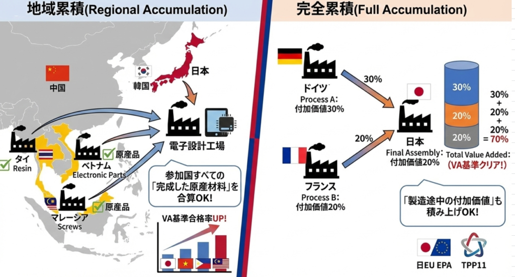 • 仕組み: ASEANやRCEPなど、複数の国が参加する枠組みで、参加国すべての材料を合算できます。