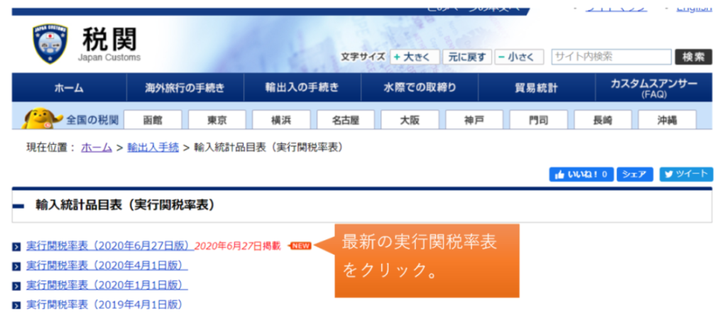 日本に輸入するときの関税率は税関HPから調べられます。